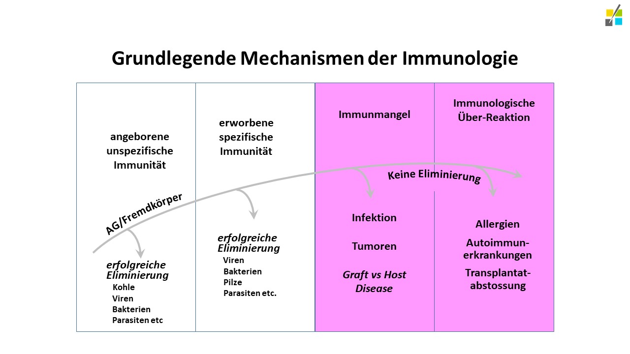 Die Immunologie beschäftigt sich grundsätzlich mit der Abwehr von Infektionen. Darüber hinaus sorgt das Immunsystem für die Vermeidung von Allergien und Autoimmun-Erkrankungen. Folgende Abbildung stellt links in Weiß die normale Funktion des Immunsystems dar, rechts in Magenta die Erkrankungen bei dessen Funktionsverlust.